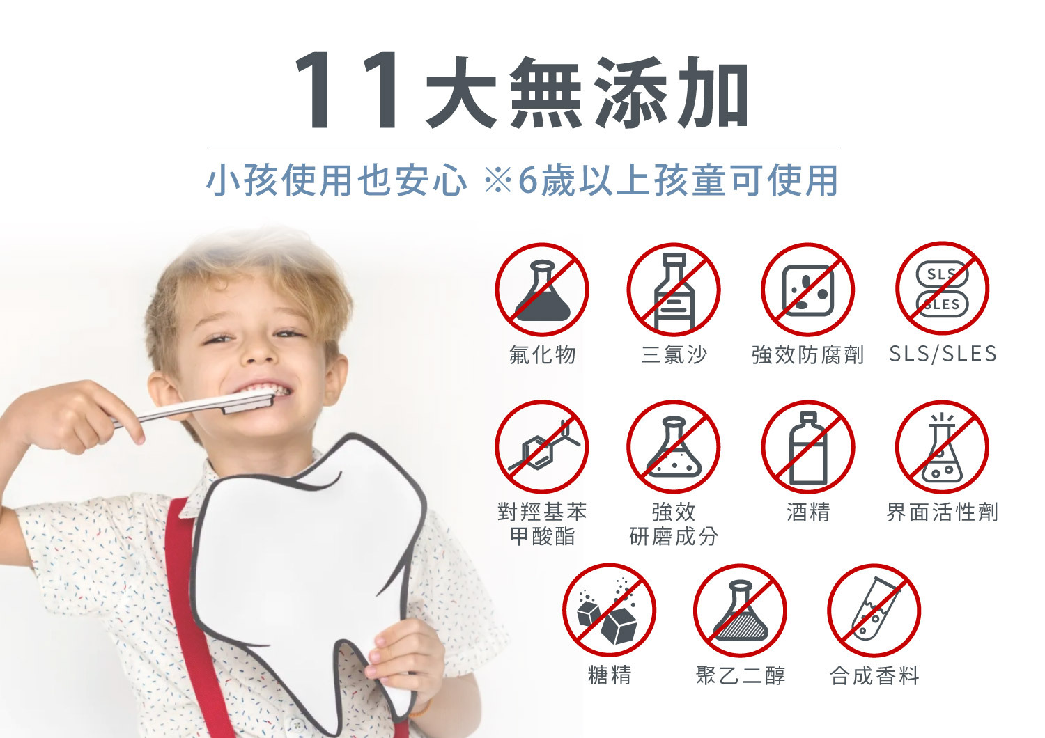 ■ 不含氟化物、三氣沙、防腐劑、SLS/SLES、Paraben、研磨成分