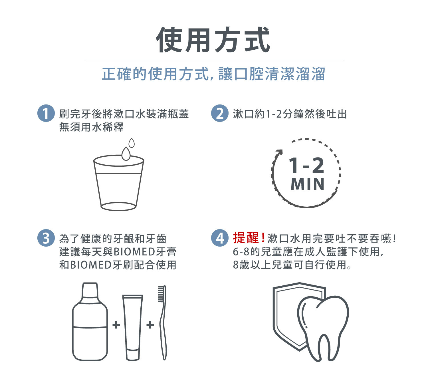 配合刷牙後使用,將漱口水裝滿瓶蓋漱遍口腔牙缝及牙齦後吐出。不需稀釋,漱口1分鐘可達最佳效果。6歲以上可使用,孩童建議在成人陪伴下使用。
