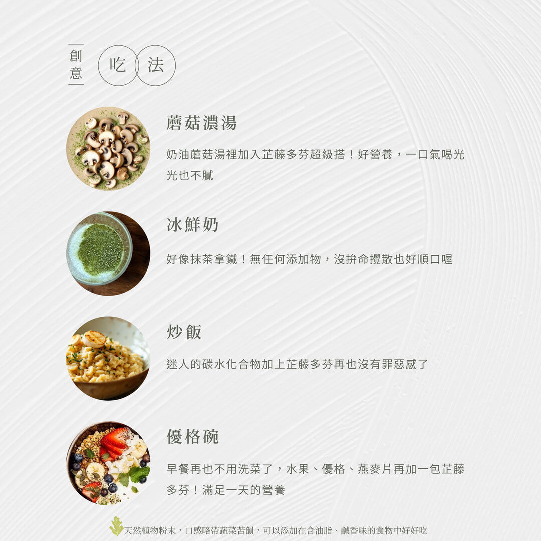 本產品為天然植物粉末,口感略帶蔬菜苦韻屬正常現象