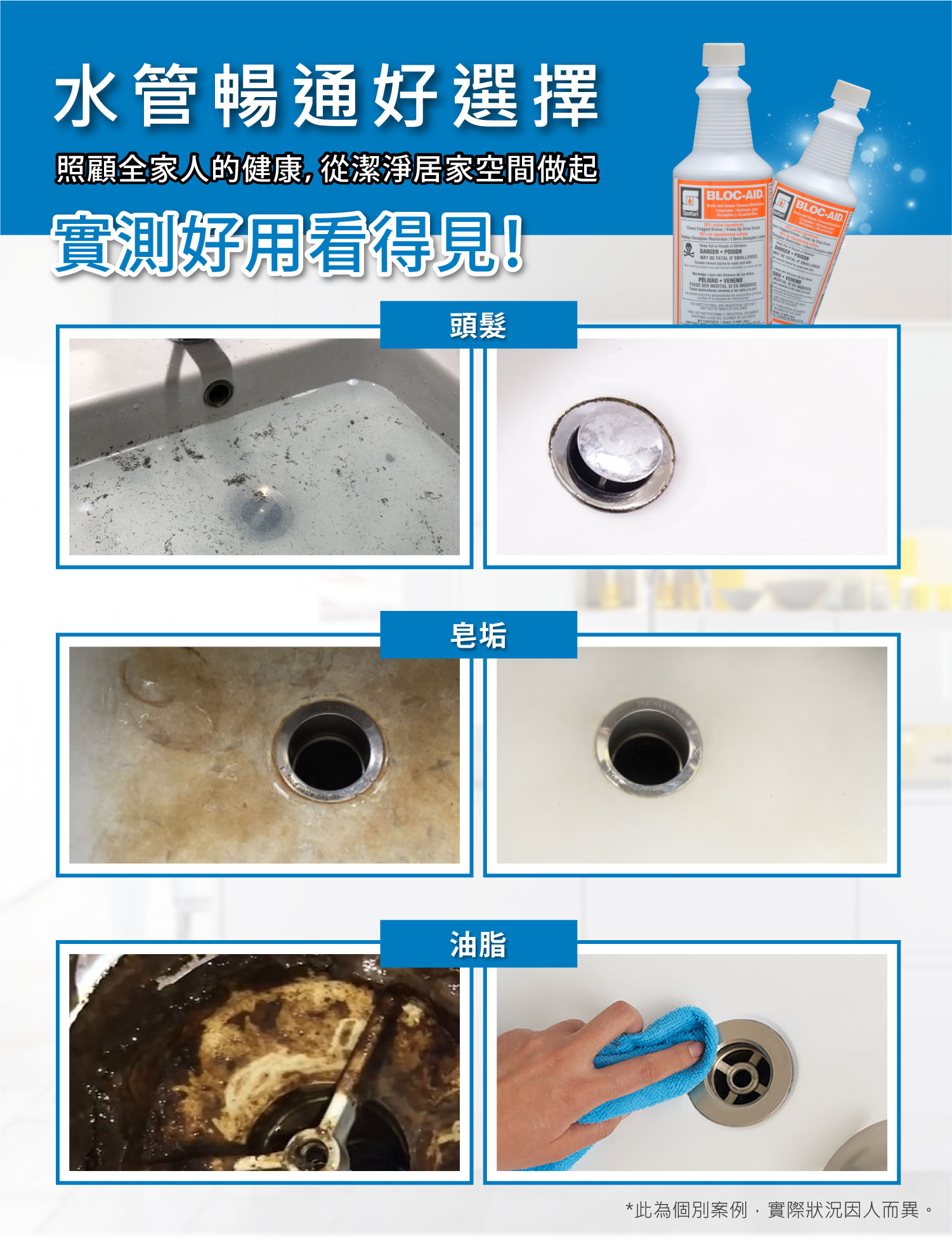 ■ 獨家Bloc-Aid重力去積分解技術,特殊配方比重大於水,和熱水一起倒入水管可快速到達阻塞來源