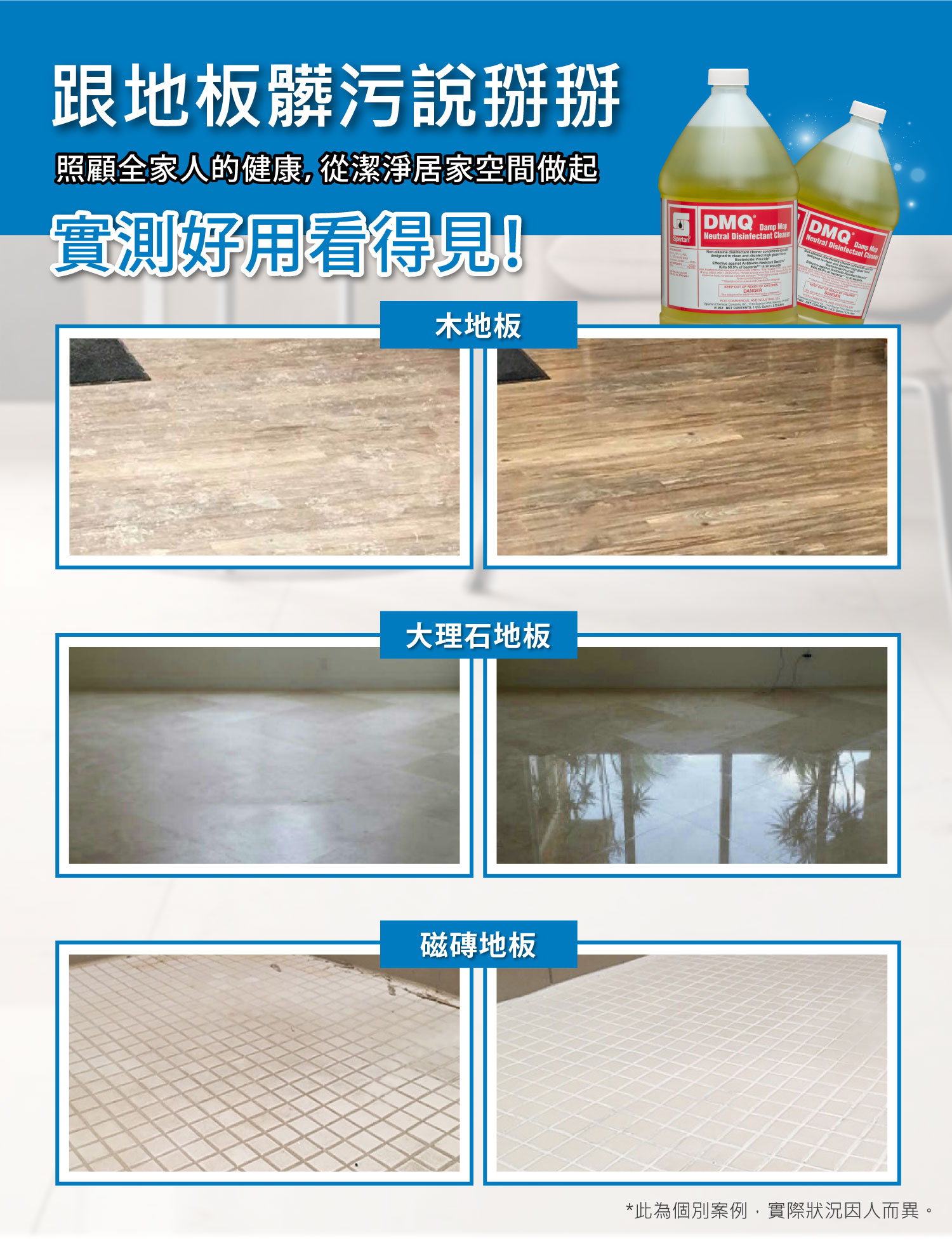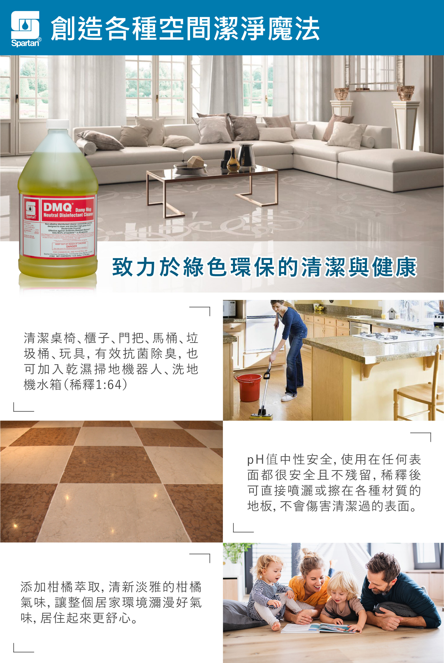3.拖地使用時,以1:64比例稀釋,直接拭地板並自然風乾即可,無須再次以清水清潔。