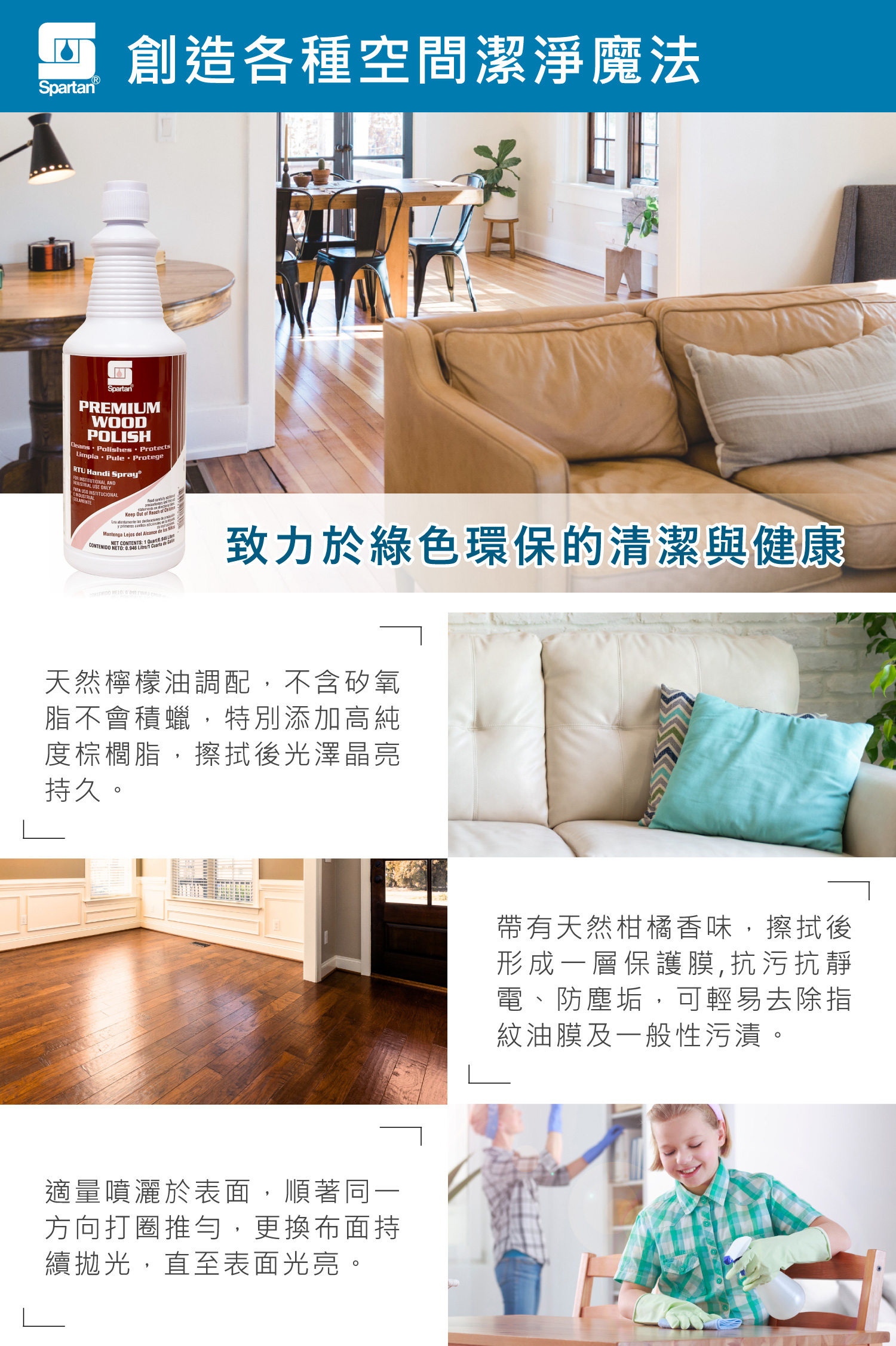 ■ 四合一高效配方,只需簡單擦拭,就能完成去污、防塵、亮光、防水四大步驟!
