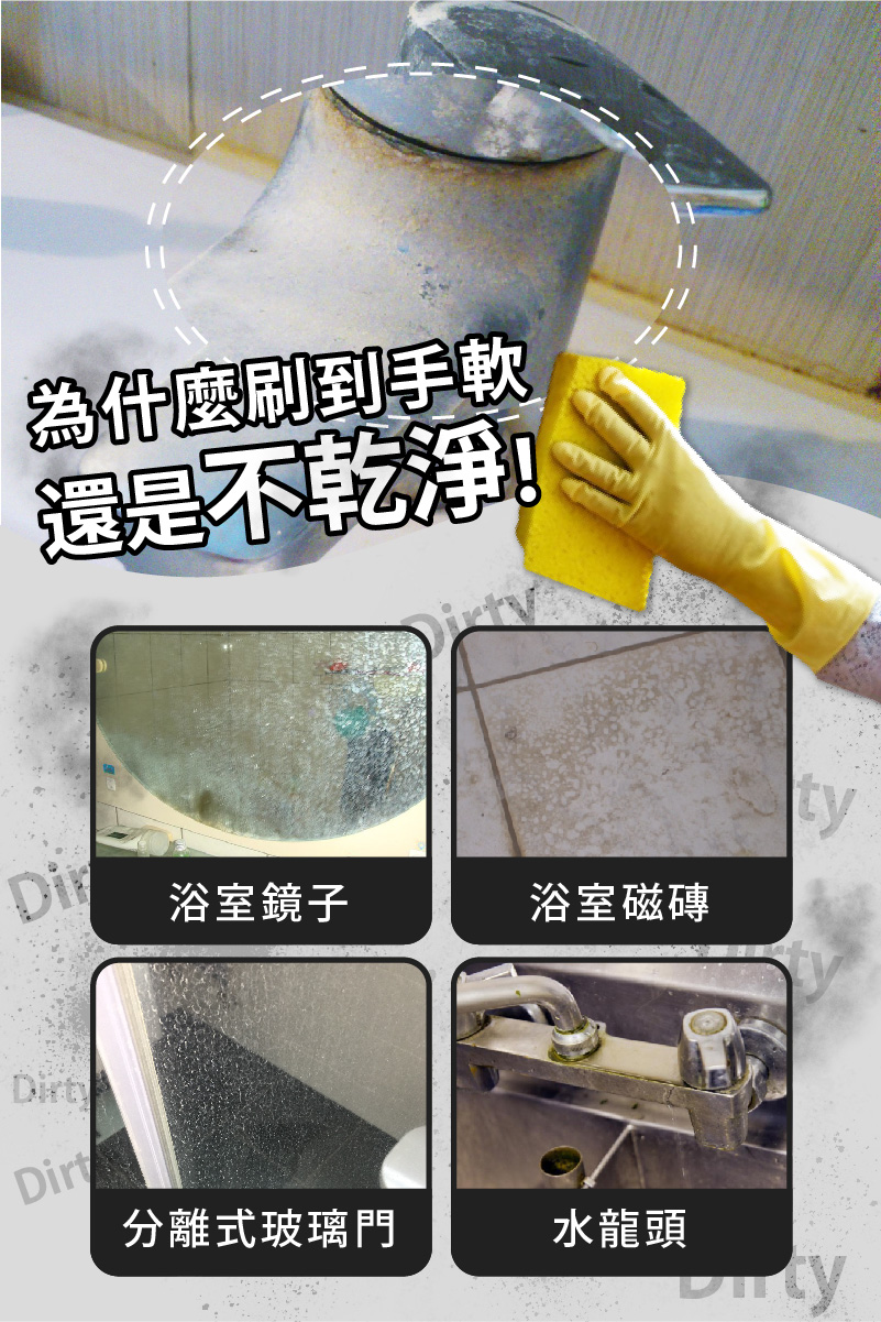 使用方法非常簡單,直接塗抹在骯髒表面或將產品擠在濕潤的海綿(請勿使用菜瓜布或鋼刷),再以順時鐘方向輕輕畫圓摩擦清潔表面,將水皂垢清除之後,最後再用清水沖乾淨就完成囉!(如果皂垢累積嚴重請重複使用多次即可清除)